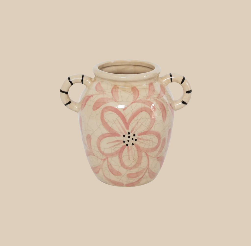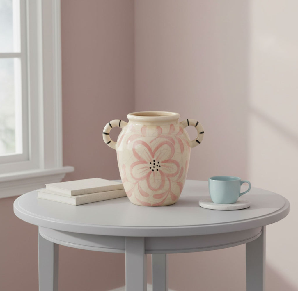 The Baby Lucia Vase, is the junior version in this gorgeous design. It showcases artisanal craftsmanship with hand-painted floral motifs rendered in soft, gentle pink hues. Each ceramic piece features distinctive linear details that complement its organic botanical design. The understated aesthetic makes it versatile for contemporary and traditional interiors alike. As a handmade creation, no two vases are identical, ensuring your arrangement holds genuine individuality. Perfect for displaying fresh or dried flowers, or as a standalone decorative accent.