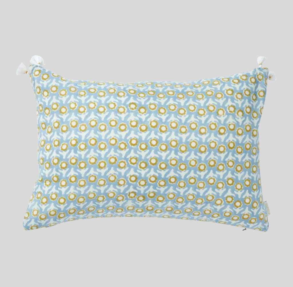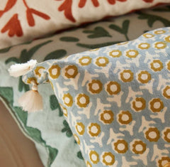 Elevate your interior with this 35 x 50 cm rectangular cushion, showcasing authentic Indian block-printed florals infused with folk-bohemian aesthetics. Meticulously crafted in our family workshop using traditional hand-printing methods, each piece features distinctive patterns and delicate tassel detailing. Constructed from premium pure cotton, this cover offers both durability and comfort. Care is straightforward—gentle hand washing or a delicate 30° machine cycle preserves its integrity, with air drying recommended. Down Feather Cushion Pad Included.
