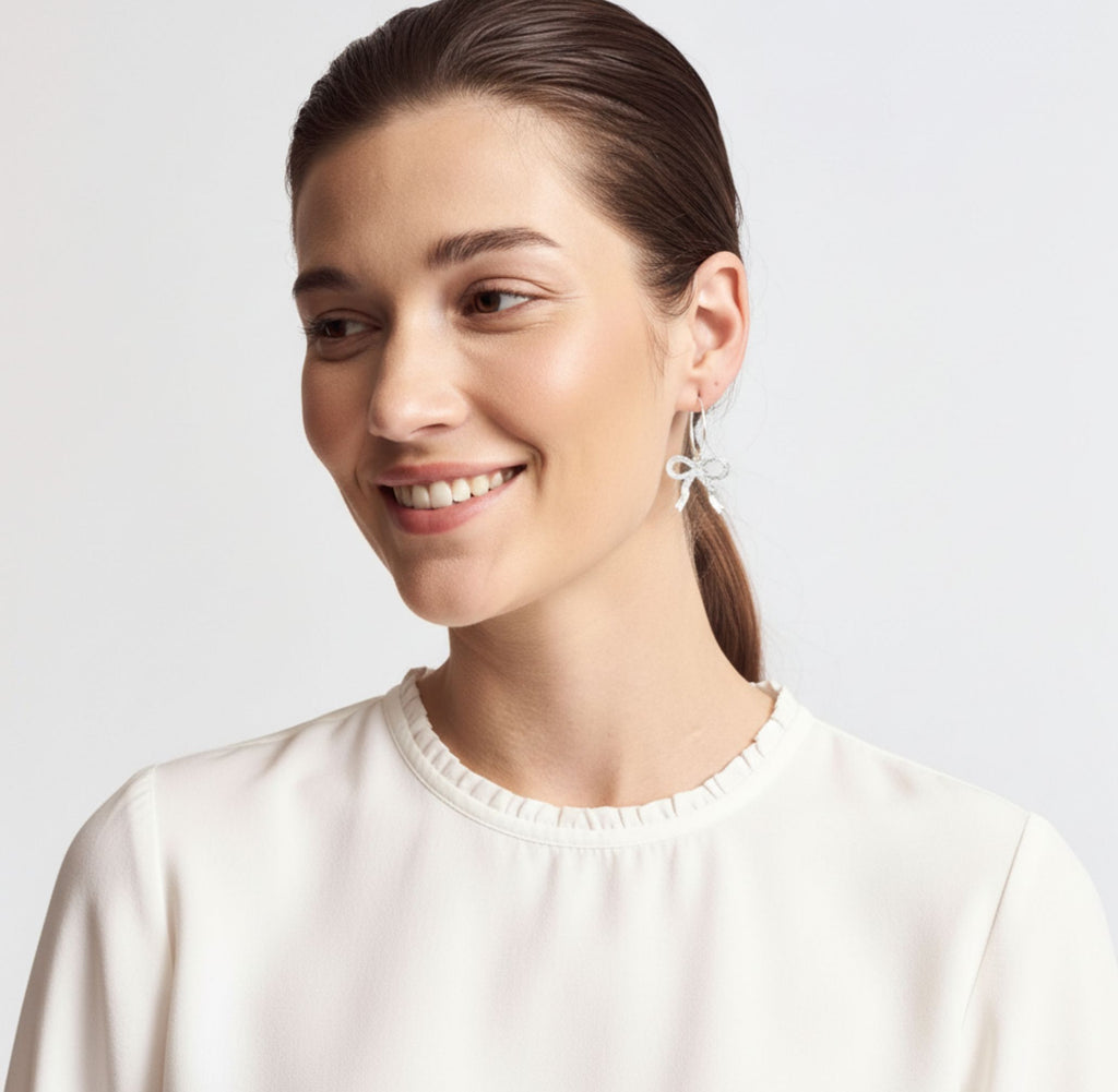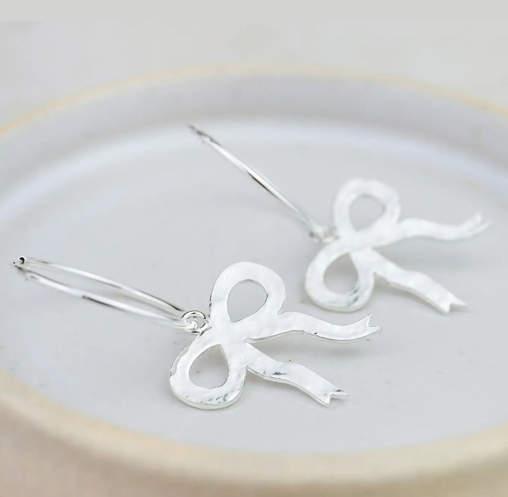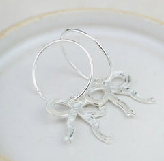 Handmade sterling silver bow charm hoops. Approximately 20mm long with a delicate texture. Hangs from a sterling silver sleeper hoop approximately 22mm in diameter.