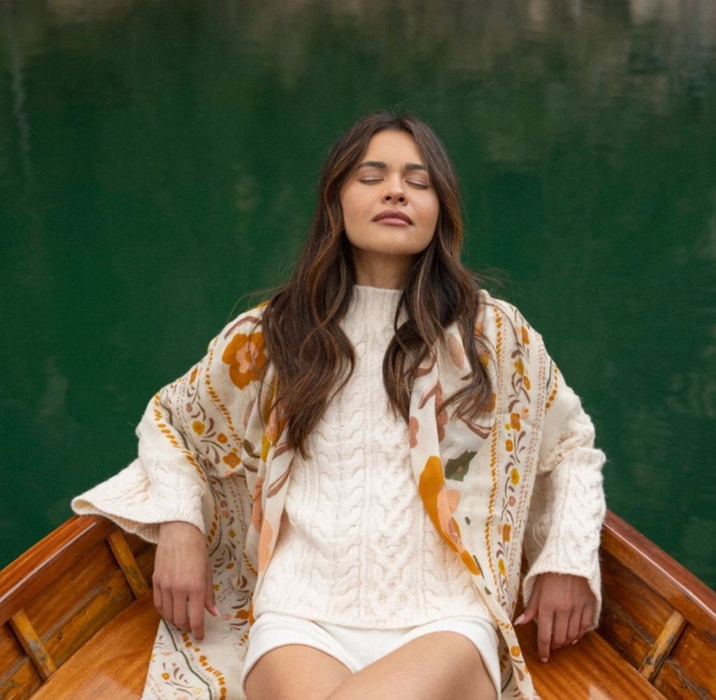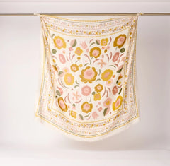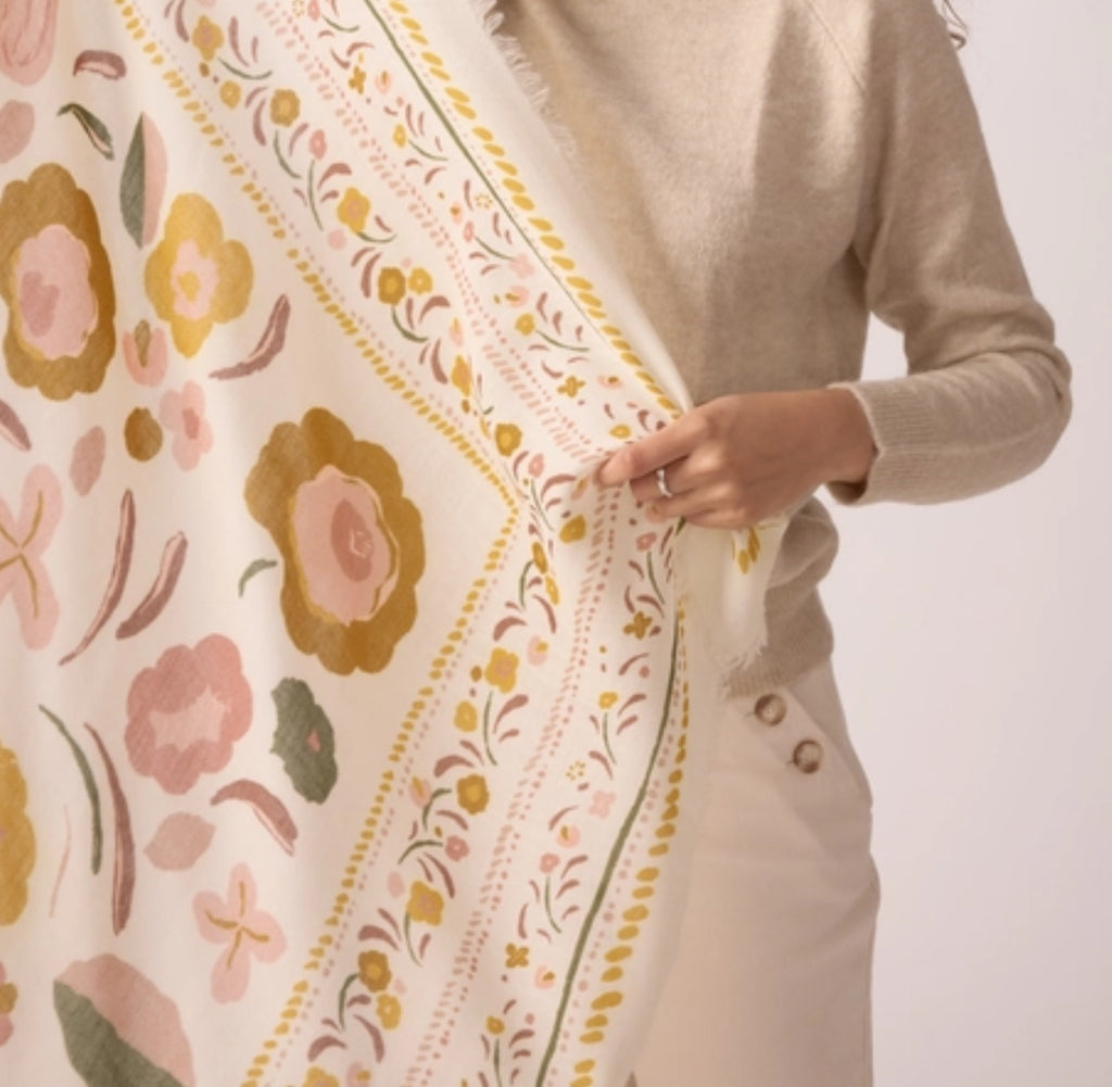 Best-seller Maradji, the Balkans scarf returns this season in a bronze color version with warm and floral tones. Made in India from a soft blend of wool (80%) and silk (20%), it charms with its quality, suppleness, and elegant patterns. This large size (130 x 130 cm) allows for a multitude of wearing styles: around the neck or even as a stole over the shoulders. A versatile and refined accessory aimed at customers seeking original and durable pieces.