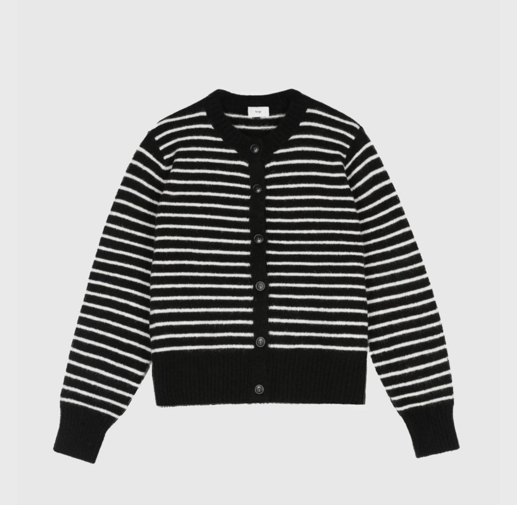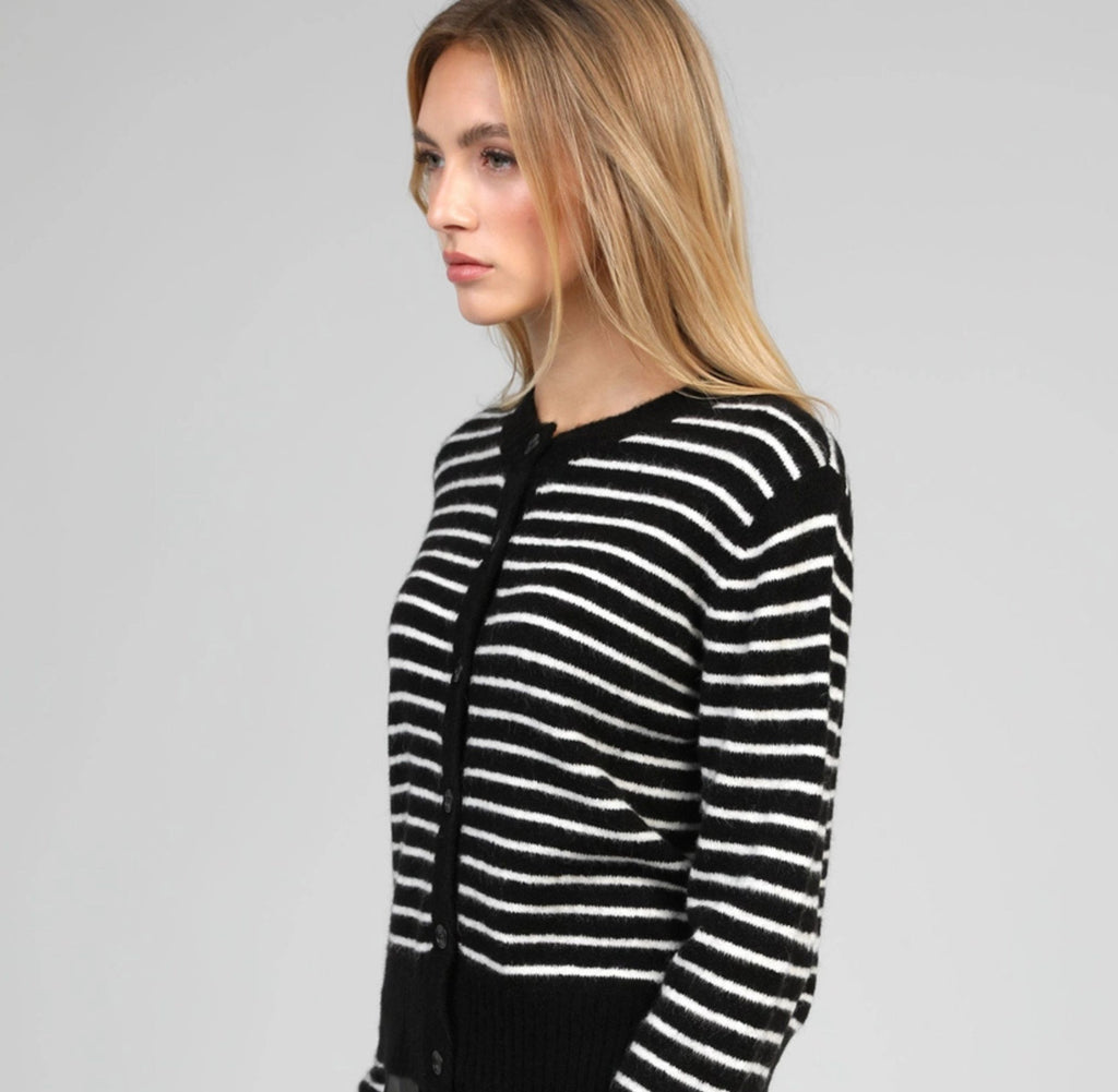 Elevate your wardrobe with this sophisticated black and white striped knit cardigan, expertly crafted for refined elegance. Featuring a classic round neckline and long sleeves, this piece delivers exceptional warmth through quality knit construction. The fitted silhouette flatters your frame whilst maintaining comfort, making it an ideal layering essential for a glamorous, feminine aesthetic. Versatile enough for both casual and polished occasions, this cardigan transitions seamlessly from day to evening wear.