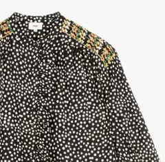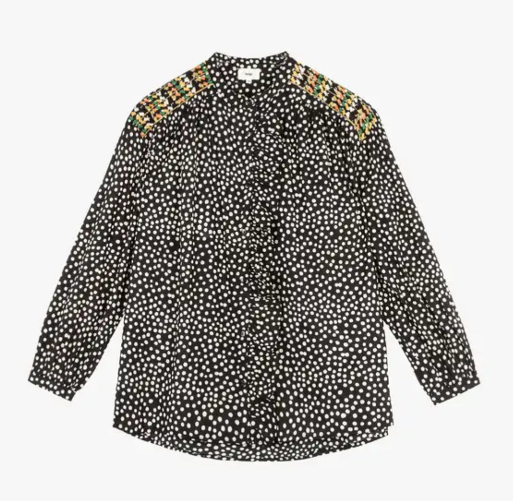 A blouse full of charm, created in a dotty cotton fabric, that adds a refined yet playful touch. Its oversized fit ensures comfort and effortless style, with colourful embroidery at the shoulders, which offers a distinctive, artisan detail that sets this blouse apart. A pretty ruffle at the buttons, this shirt is perfect for layering or wearing solo, it combines classic with fun!
