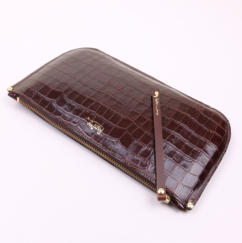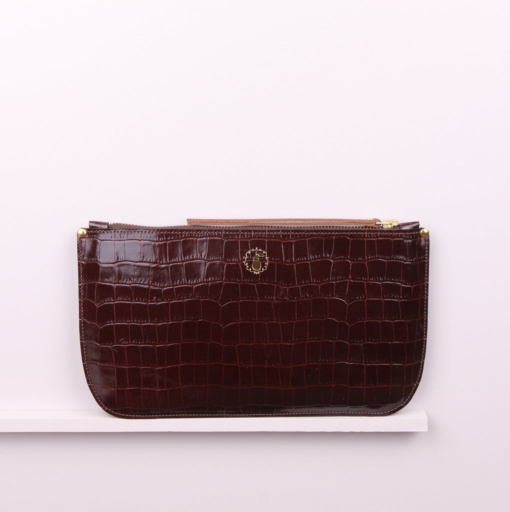 Unlined Clutch Bag - Italian Hi Shine Mocha Brown 'Croc' Embossed Leather