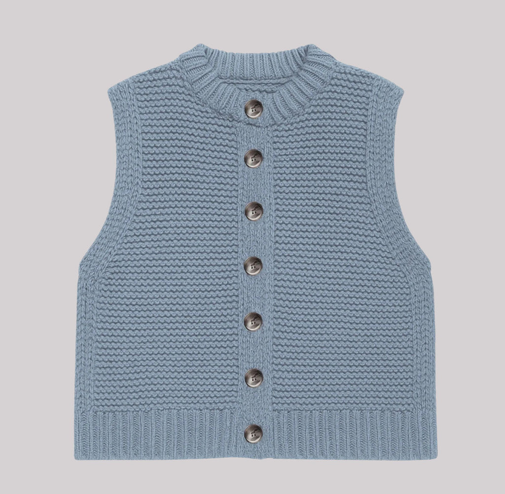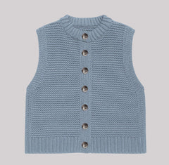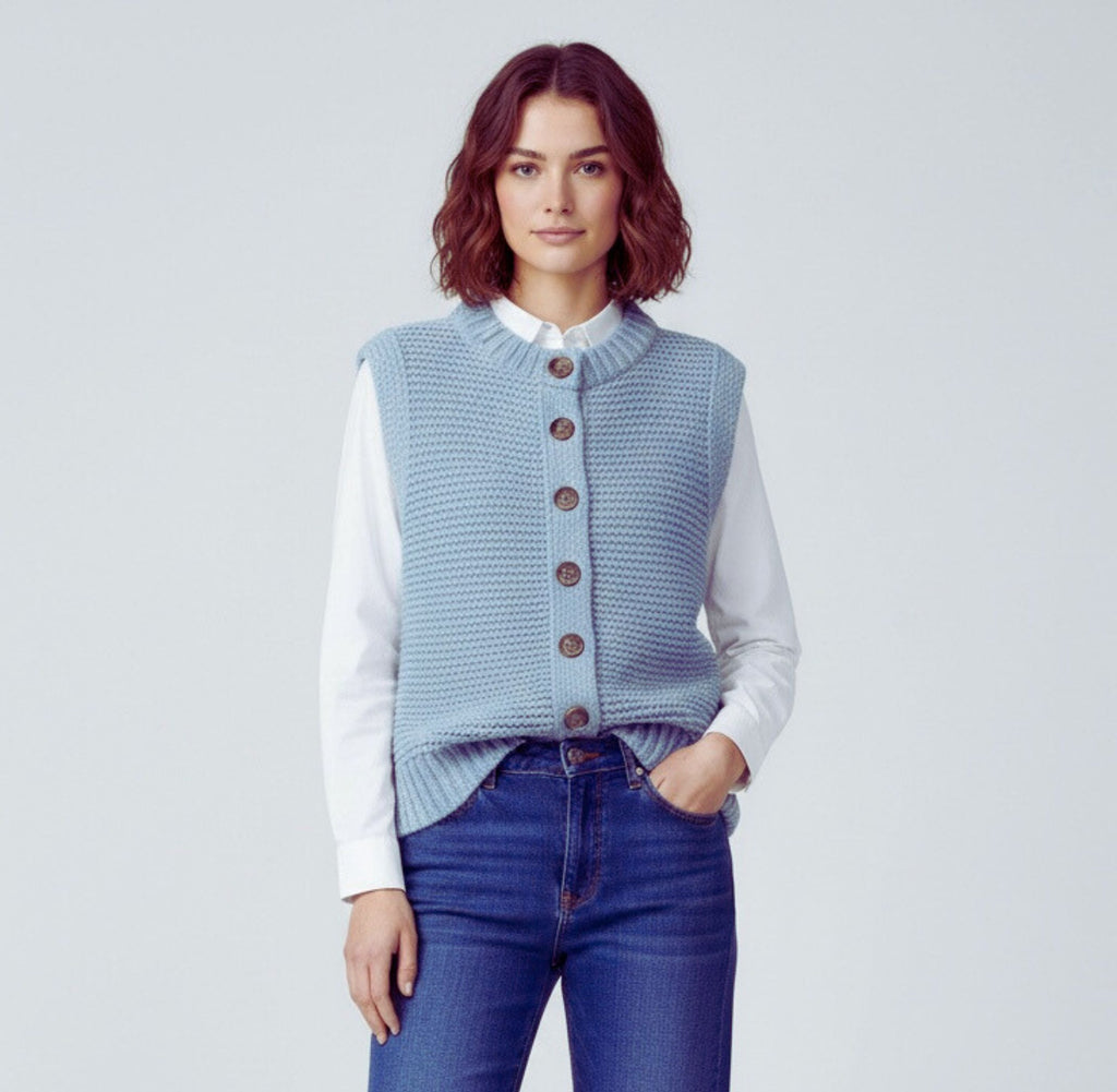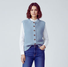 Elevate your everyday wardrobe with this blue/grey round neck knitted gilet, designed for effortless versatility. The fitted cut flatters your silhouette whilst remaining comfortable for all-day wear, making it the perfect layering piece to pair with your favourite jeans or dress up for occasions. Featuring distinctive horn-effect buttons, this cardigan delivers timeless style with functional appeal. For an optimal fit, we recommend sizing up if you fall between two sizes.