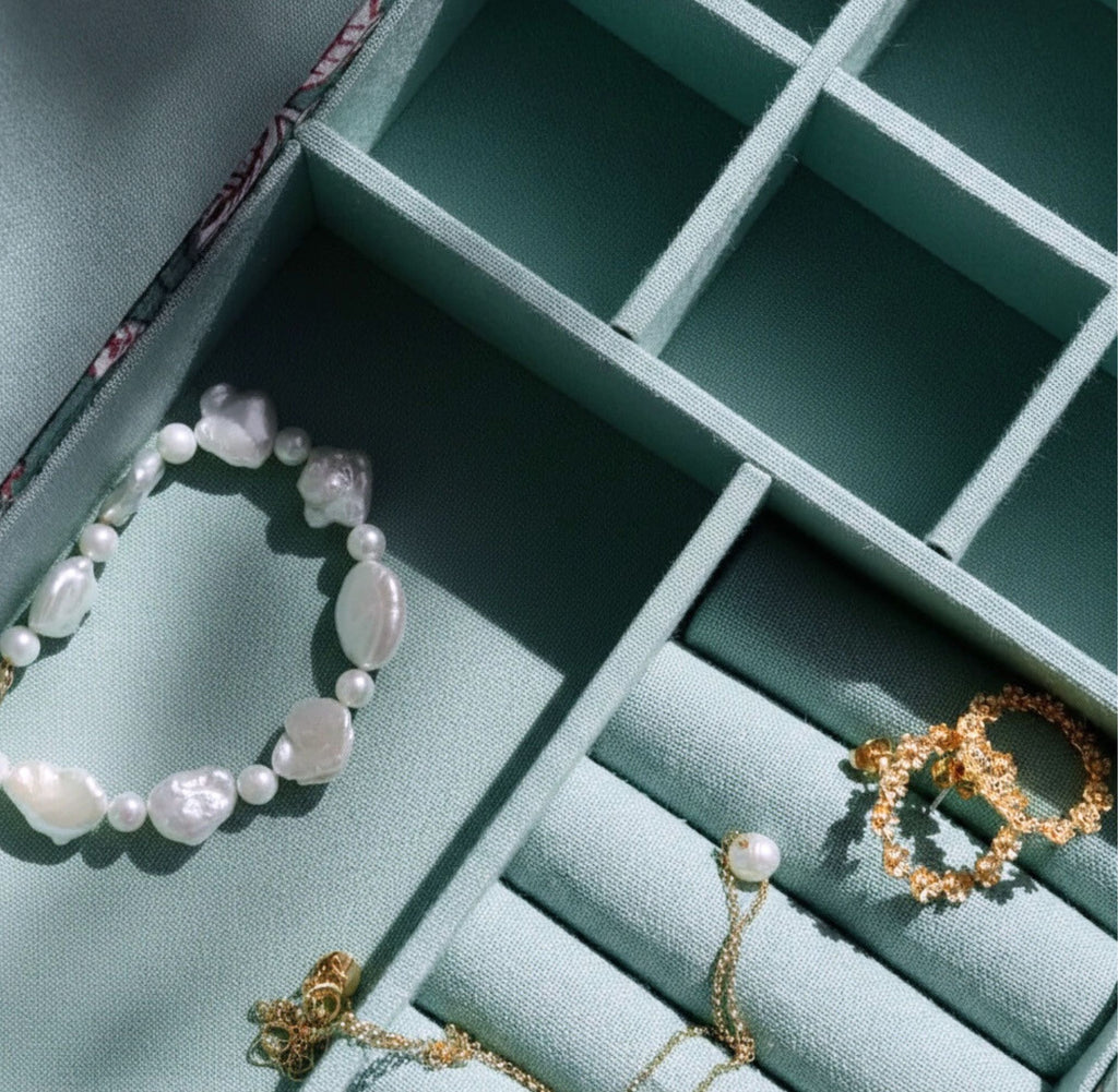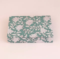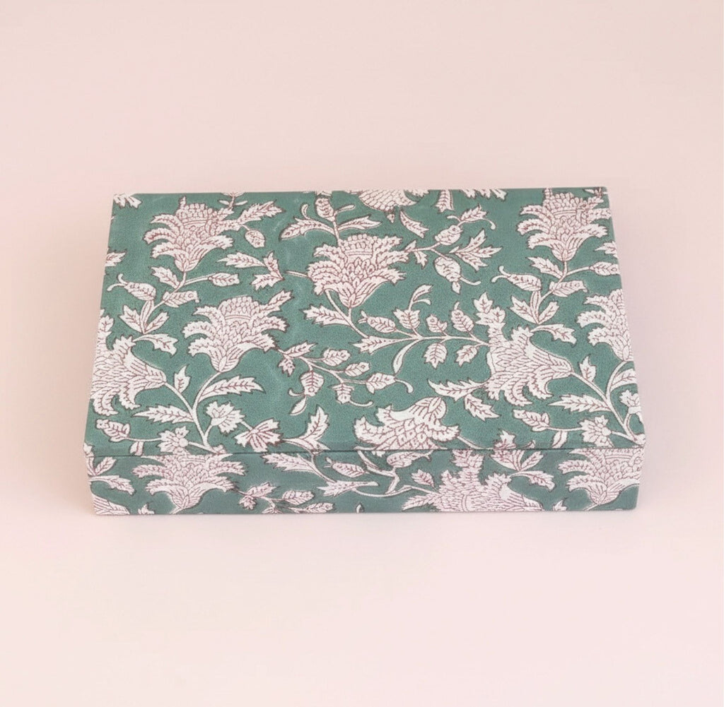 This gorgeous jewellelry box is handcrafted by artisans. Slight irregularities in the textile may occur due to it's hand block-printed nature, making each piece an artisanal luxury.