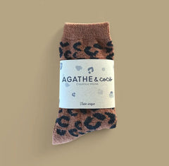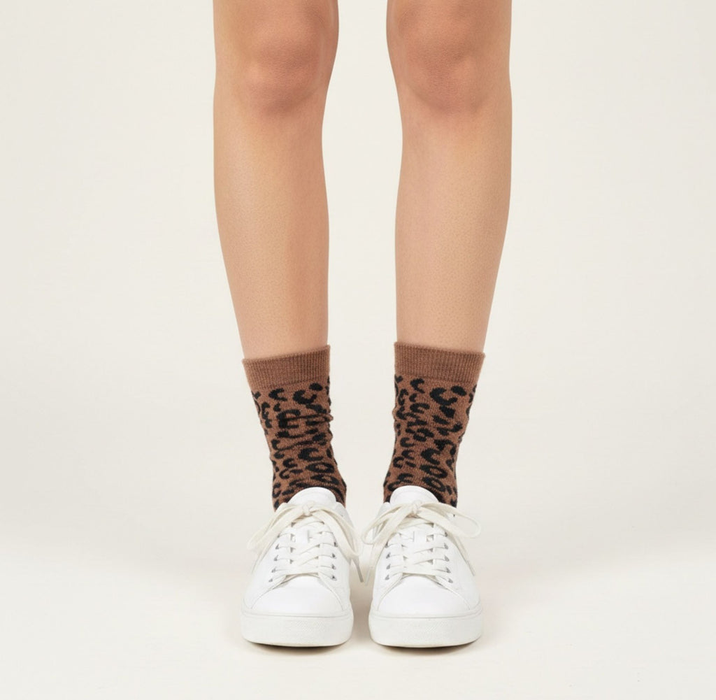 These charcoal socks feature a distinctive leopard print design that elevates everyday styling with subtle animal-inspired sophistication. The carefully curated chocolate brown palette with contrasting spots delivers visual interest without overwhelming your wardrobe. Cut to a mid-height profile, they strike an ideal balance—neither too minimal nor too prominent—making them exceptionally versatile with trainers and casual footwear. A refined alternative to conventional sock choices for those seeking understated personality in their basics. We are smitten with this cute pair of socks, as well as their soft cotton/wool composition.
