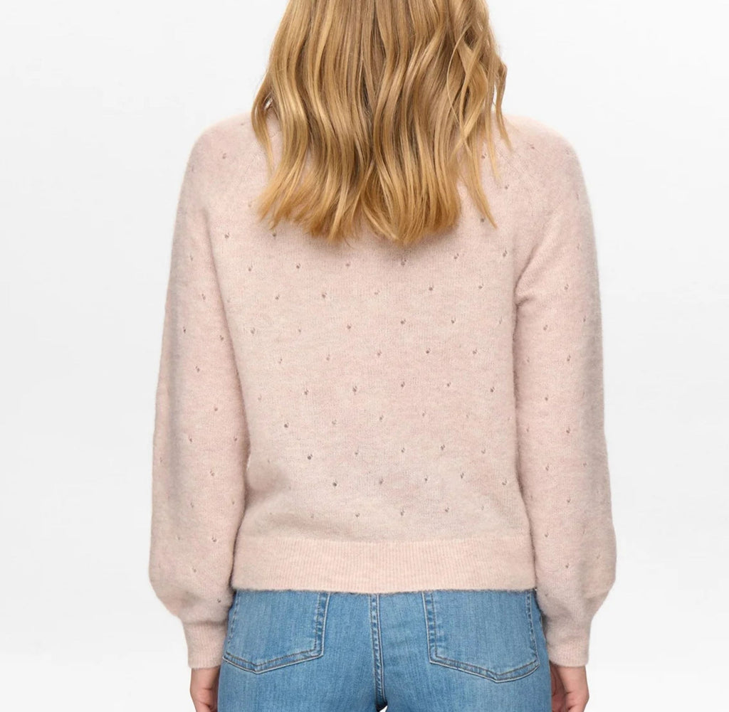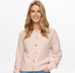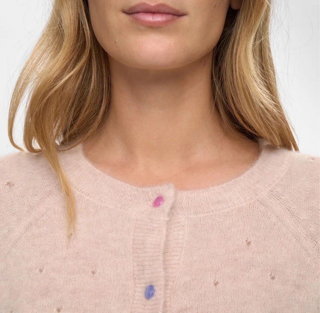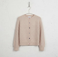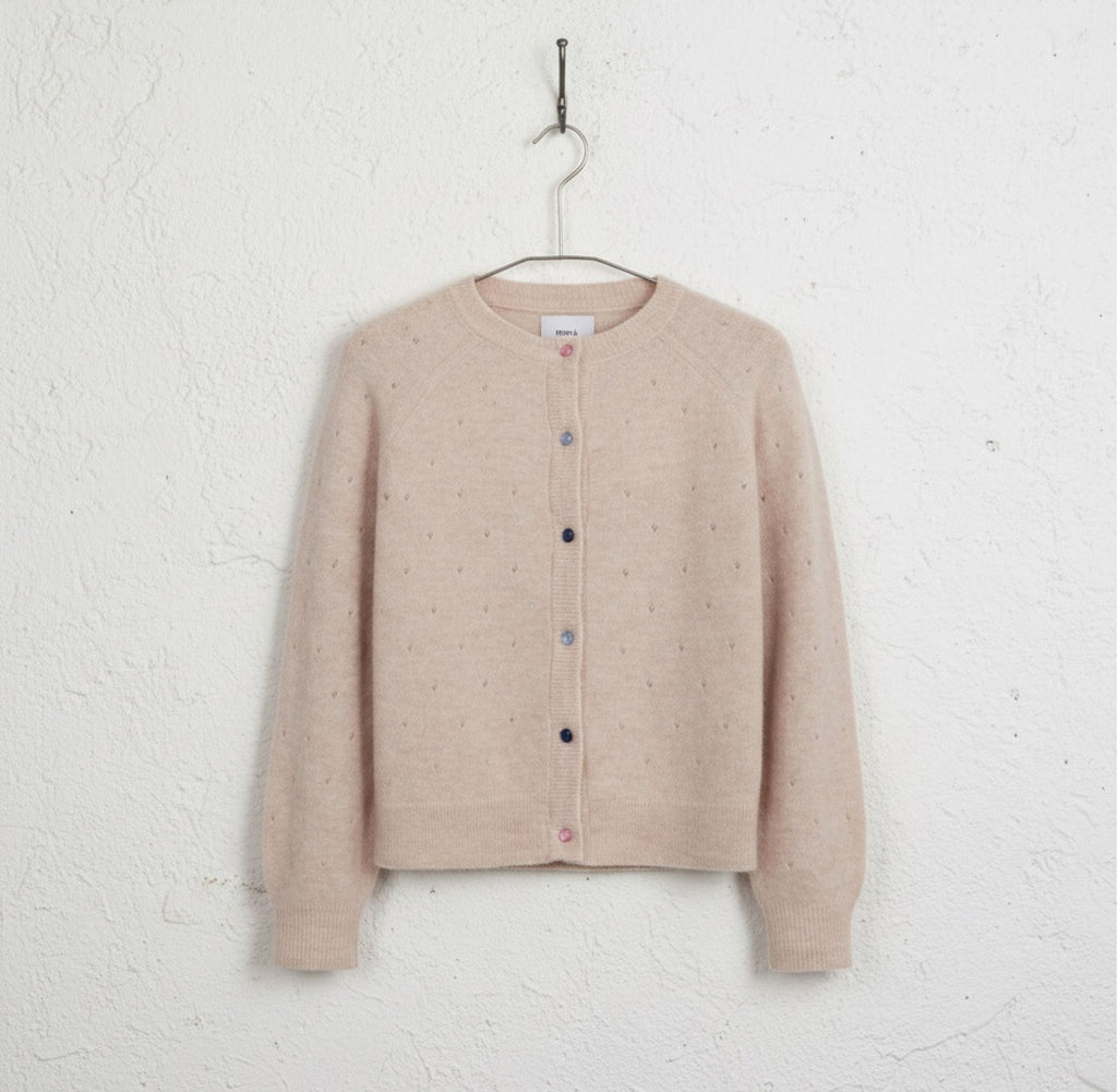Nurietto Pointelle Cardigan in soft mushroom pink, crafted from luxuriously gentle wool with a refined pointelle knit texture. Features a classic round neckline and contrasting coloured buttons that add subtle visual interest. The sumptuous fabric drapes beautifully whilst maintaining its shape, making this an essential layering piece for effortless sophistication. Perfect for transitional seasons or as a lightweight layer year-round.