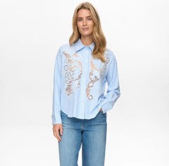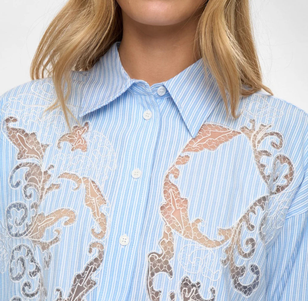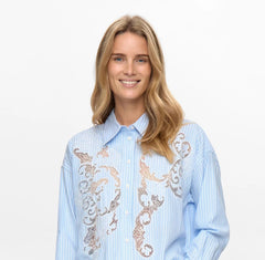 The Nuvalerie Blouse combines timeless elegance with contemporary design. This blue and white striped piece features delicate lace panel inserts that add refined texture and visual interest. Long sleeves provide versatile coverage, making it suitable for both professional and casual settings. The thoughtful placement of lace detailing elevates the classic striped pattern, creating a sophisticated silhouette that works beautifully layered or worn standalone. Perfect for those who appreciate quality craftsmanship and understated luxury in their everyday wardrobe.