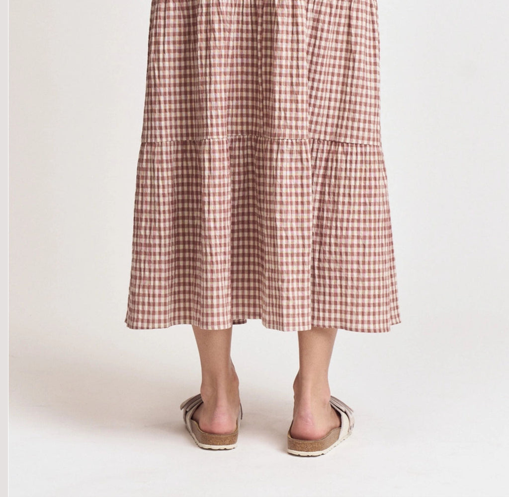 PRE - ORDER - Rose pink and cream gingham check, creates a charming, timeless aesthetic on this tiered skirt. Crafted from 100% cotton, it offers breathable comfort and natural drape that moves beautifully with each step. The layered silhouette adds dimension and playful volume, making it versatile for casual outings or dressed-up occasions. A wardrobe essential that balances vintage-inspired style with everyday wearability.