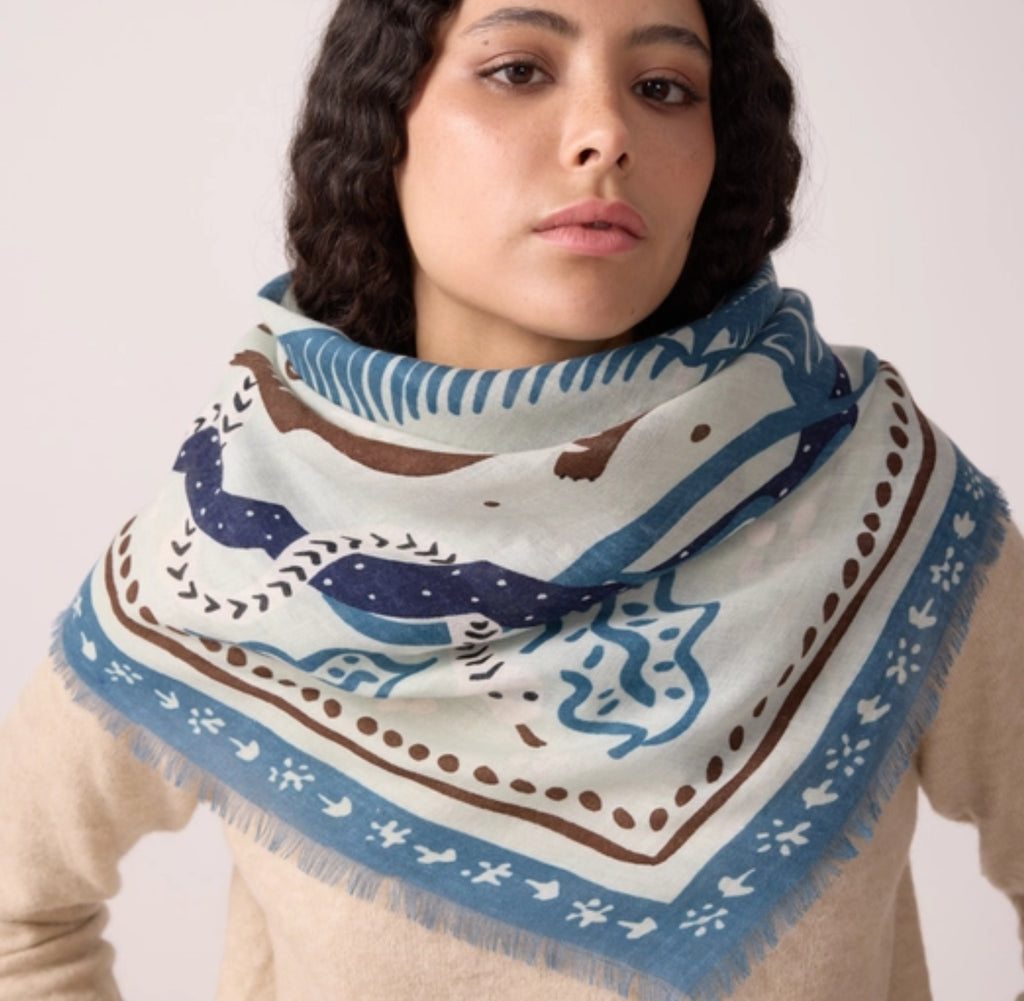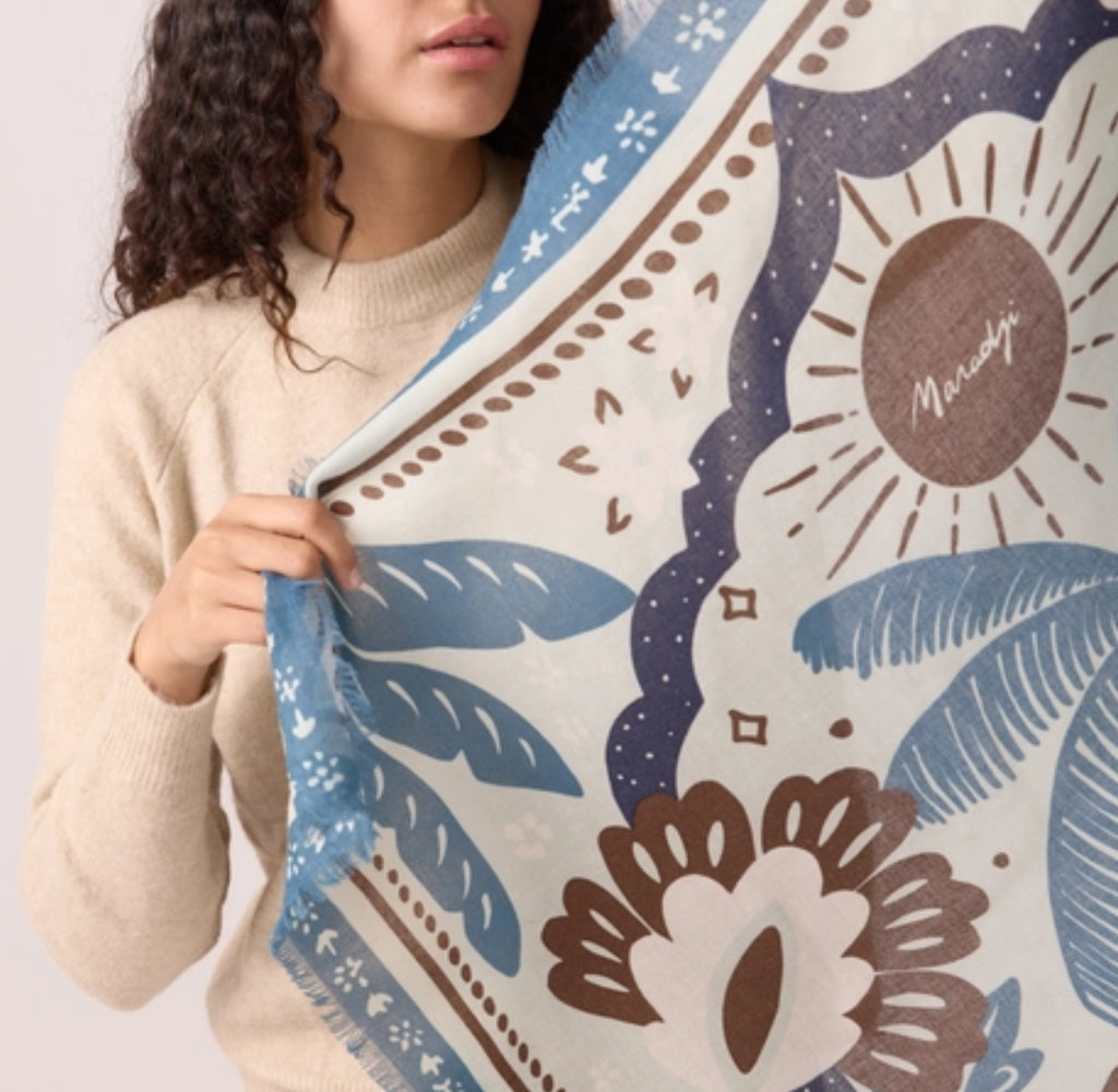 Square scarf in wool, cotton, and modal, printed with an exclusive graphic and botanical pattern, in which a stylized tiger is hidden. This premium piece perfectly combines narrative exoticism with contemporary aesthetics. The noble blend of natural materials offers a fluid, warm, and soft drape, ideal for cold seasons. Its artisanal printing in India and its finish demonstrate true textile craftsmanship. 100cm x 100cm