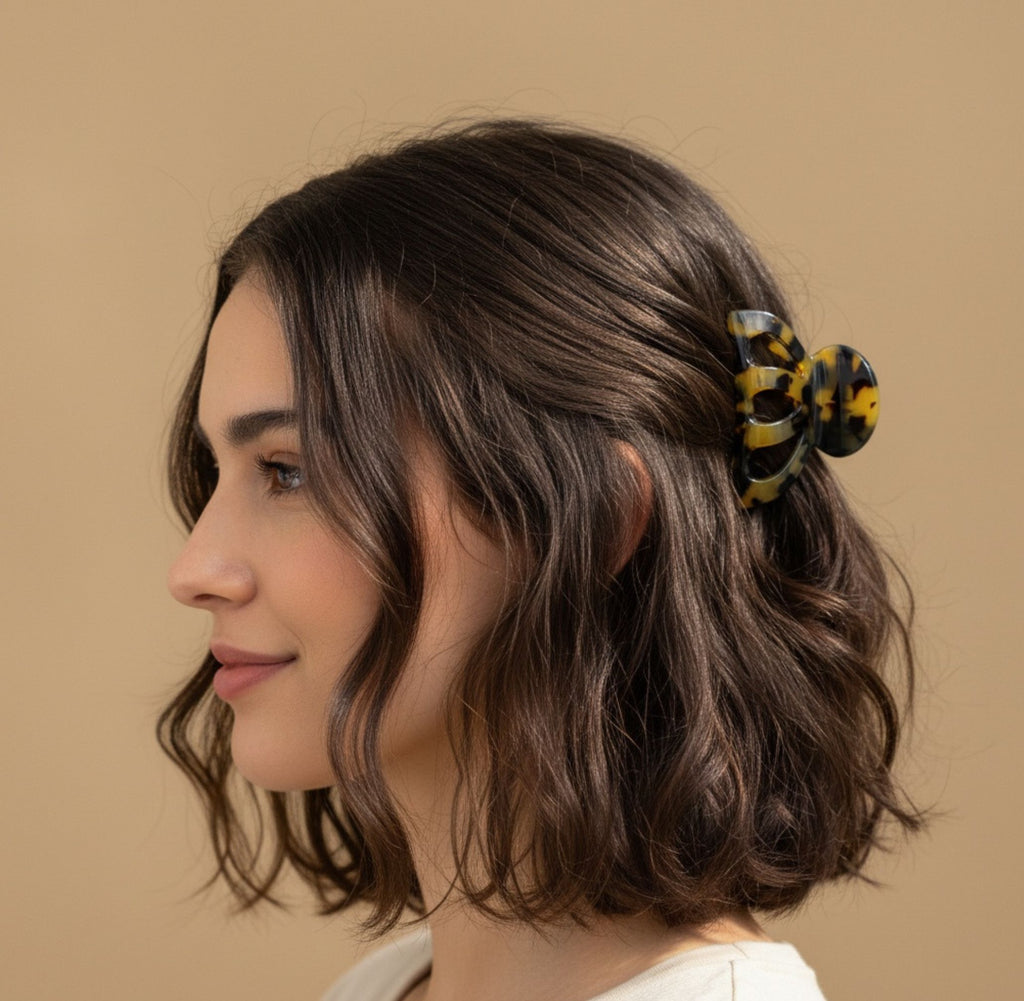We love this large dark leopard print hair clip. Its wild pattern adds an animal touch to your hairstyle. Perfect for structuring a bun or for half-up styles, this clip is a versatile accessory that suits all occasions, whether for a daily look or a more polished outfit.