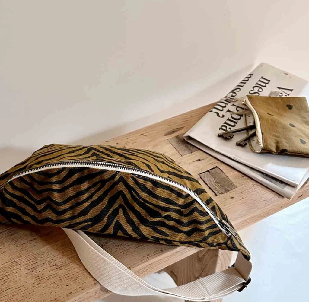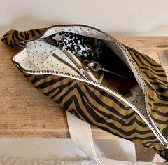 A sweet, casual bag in a washed a olive green cotton Canvas, with a printed Zebra print design. Lined with a dotty cotton fabric.