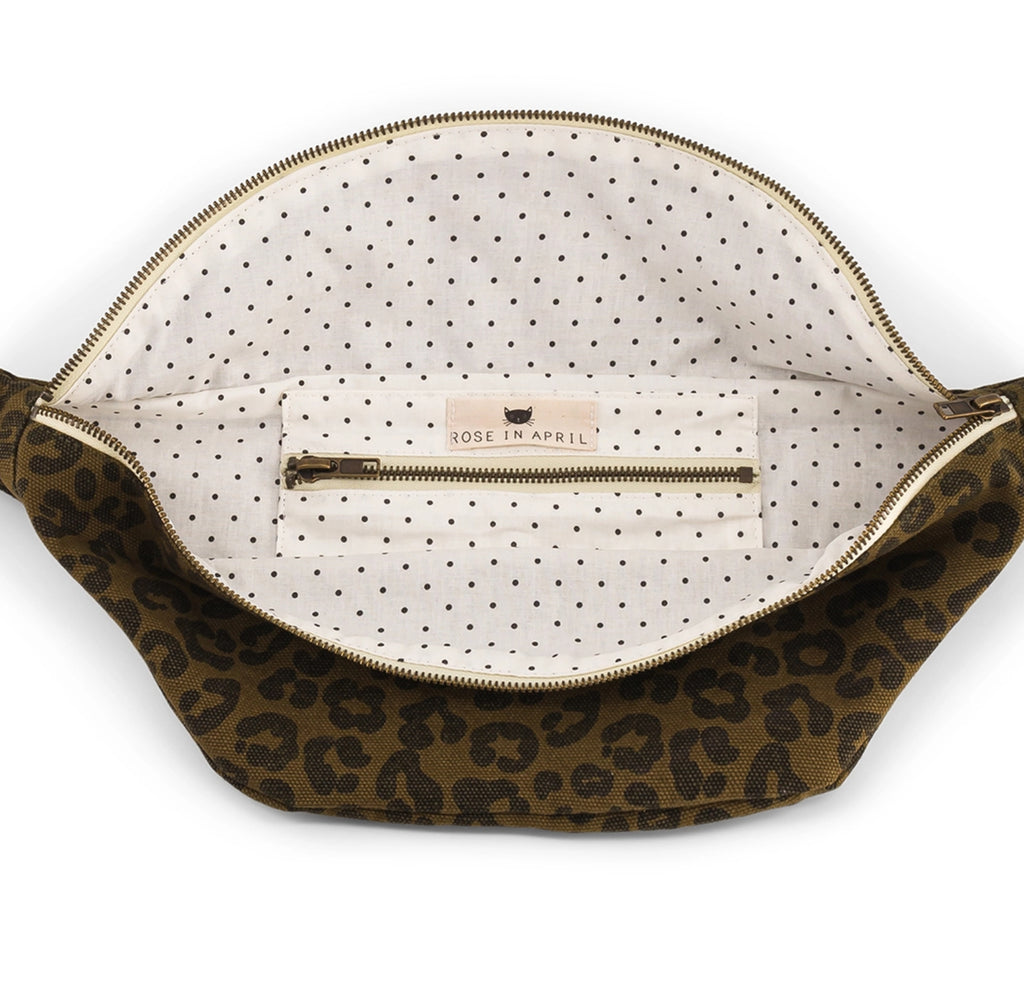 A sweet, casual bag in a washed Olive Green Canvas, with a printed Leopard print design. Lined with a dotty cotton fabric.