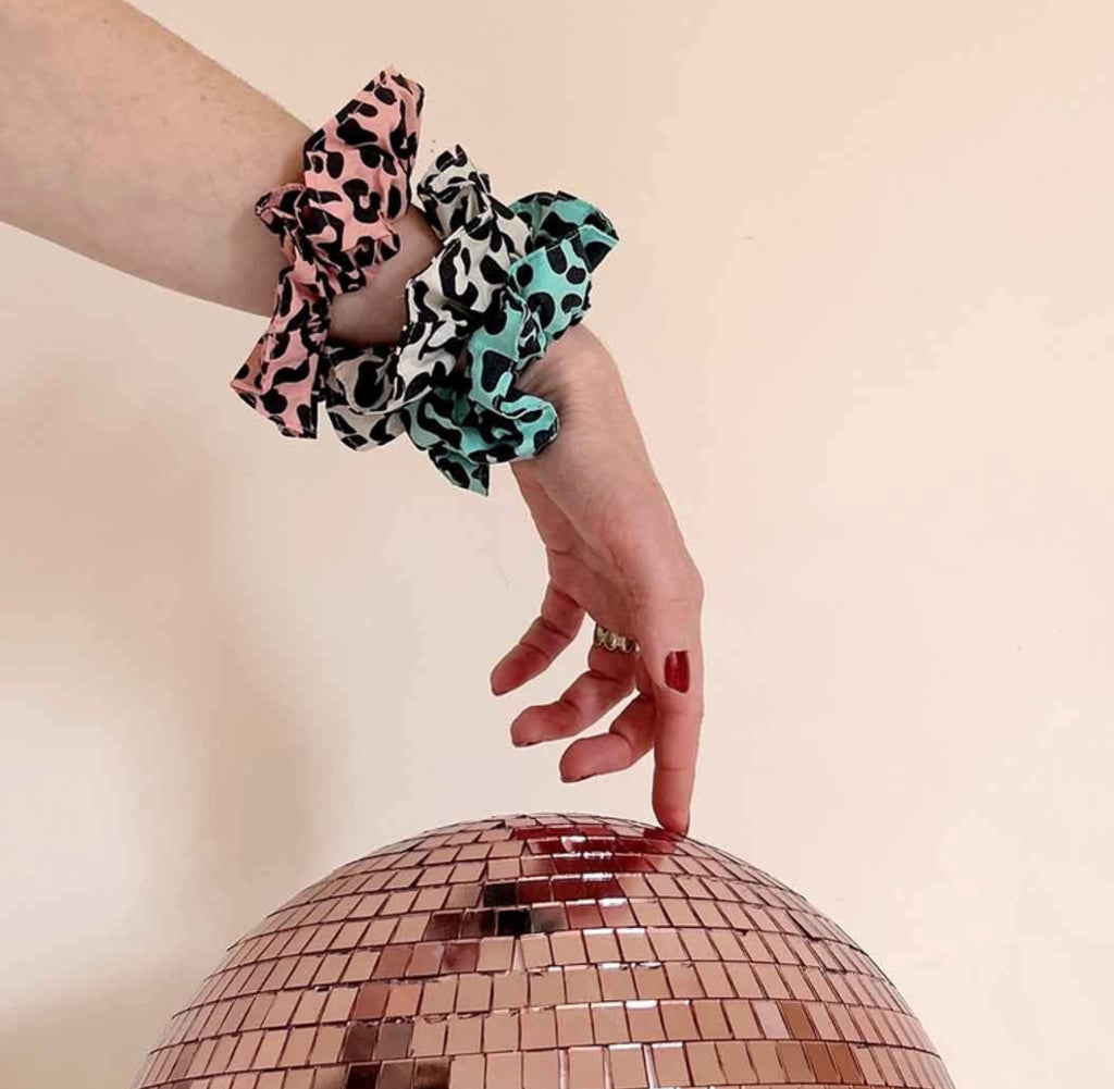 A sweet scrunchie in a linen like fabric with a graphic Leopard washed print.