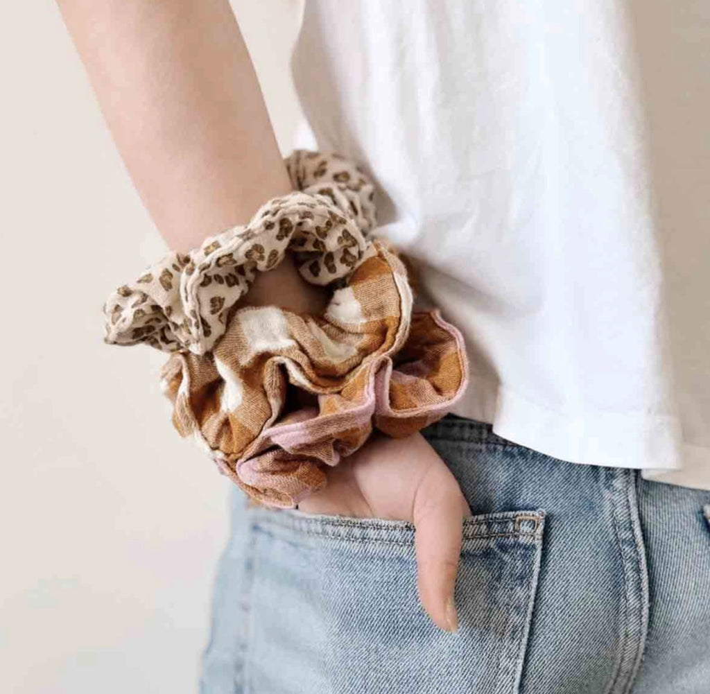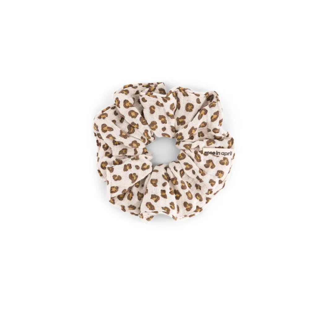 A sweet mini scrunchie in a soft fabric with a subtle Leopard washed print.