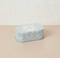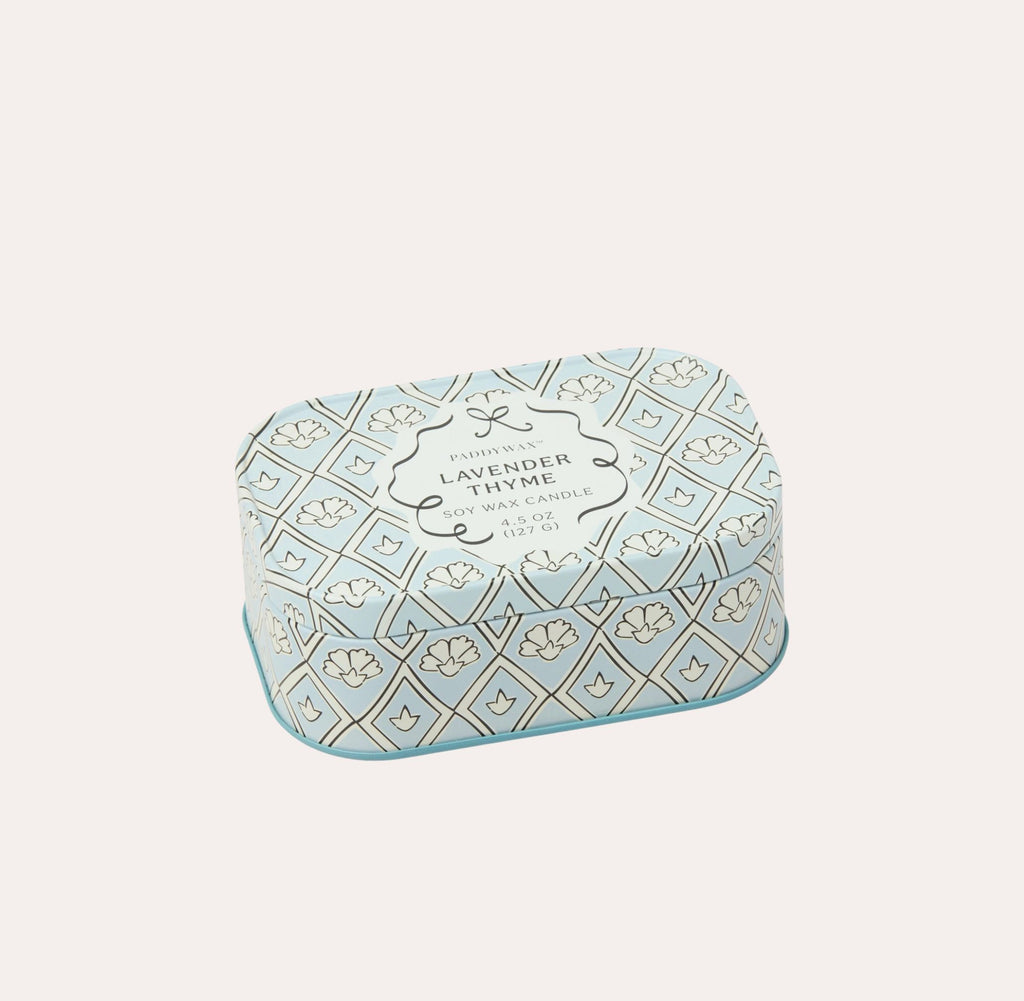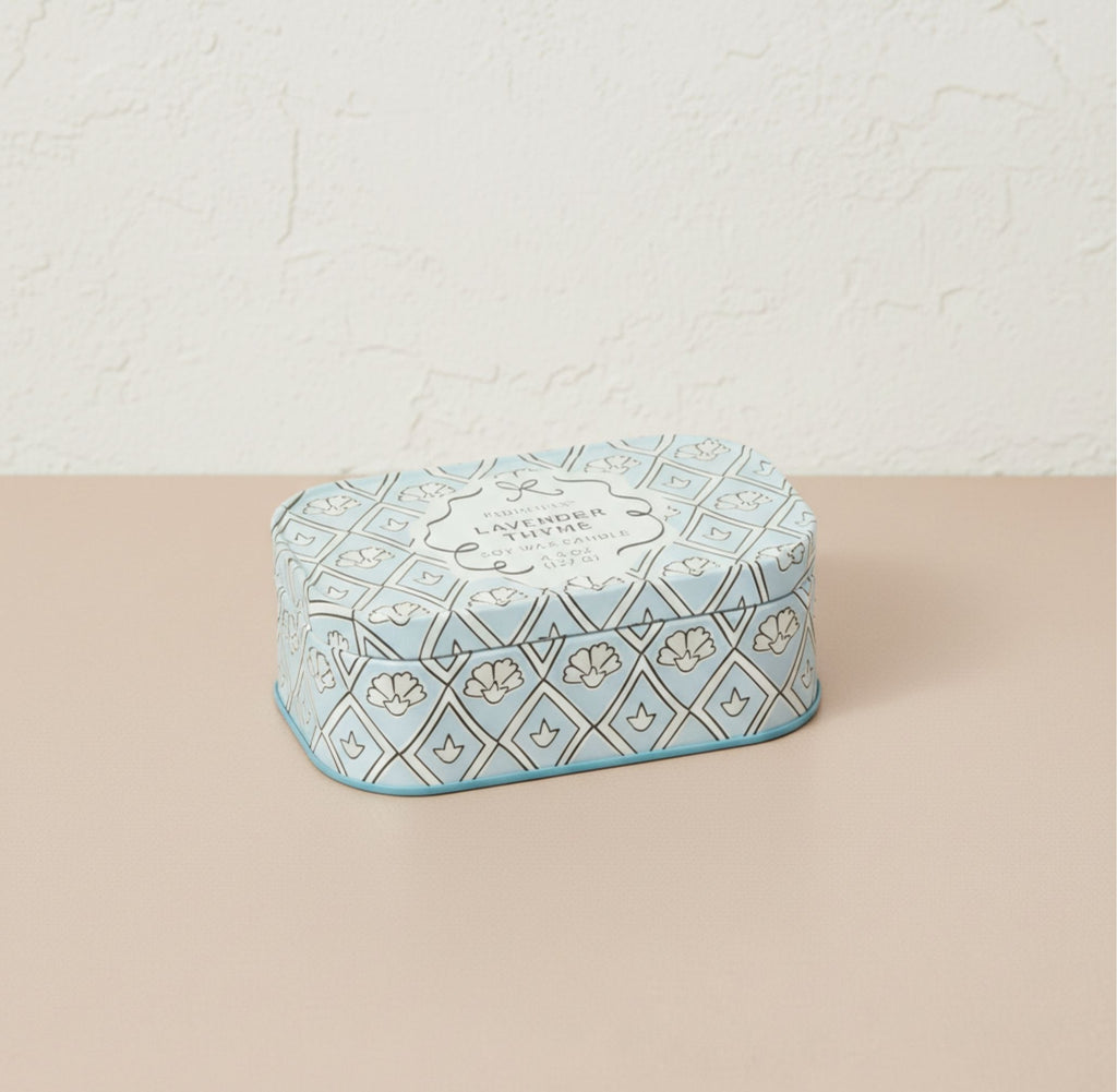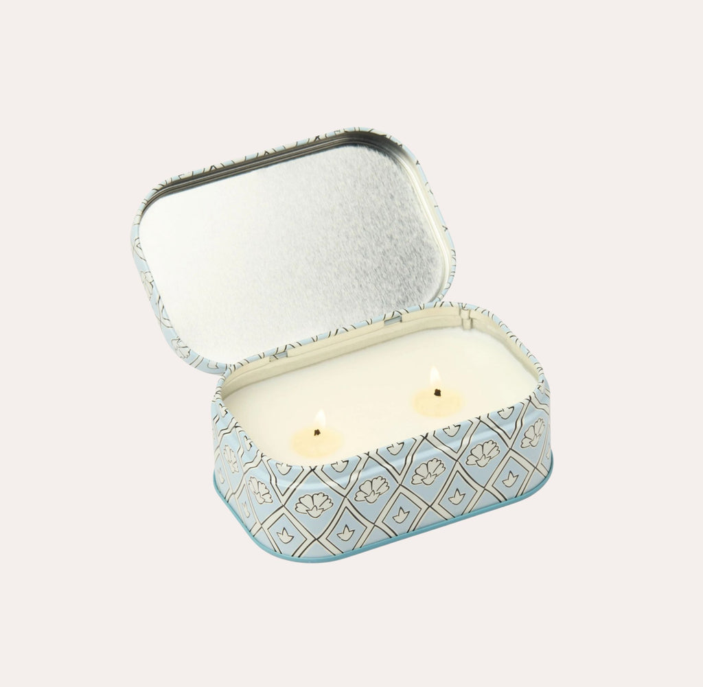 Our new Cherie collection effortlessly brings a touch of charm to any space. The new Cherie tin candle effortlessly brings a touch of charm to any space. This elegant, patterned tin has two wicks, a hinged lid, and a removable label so that once the wax has burned, it is perfectly suited to hold all your trinkets!