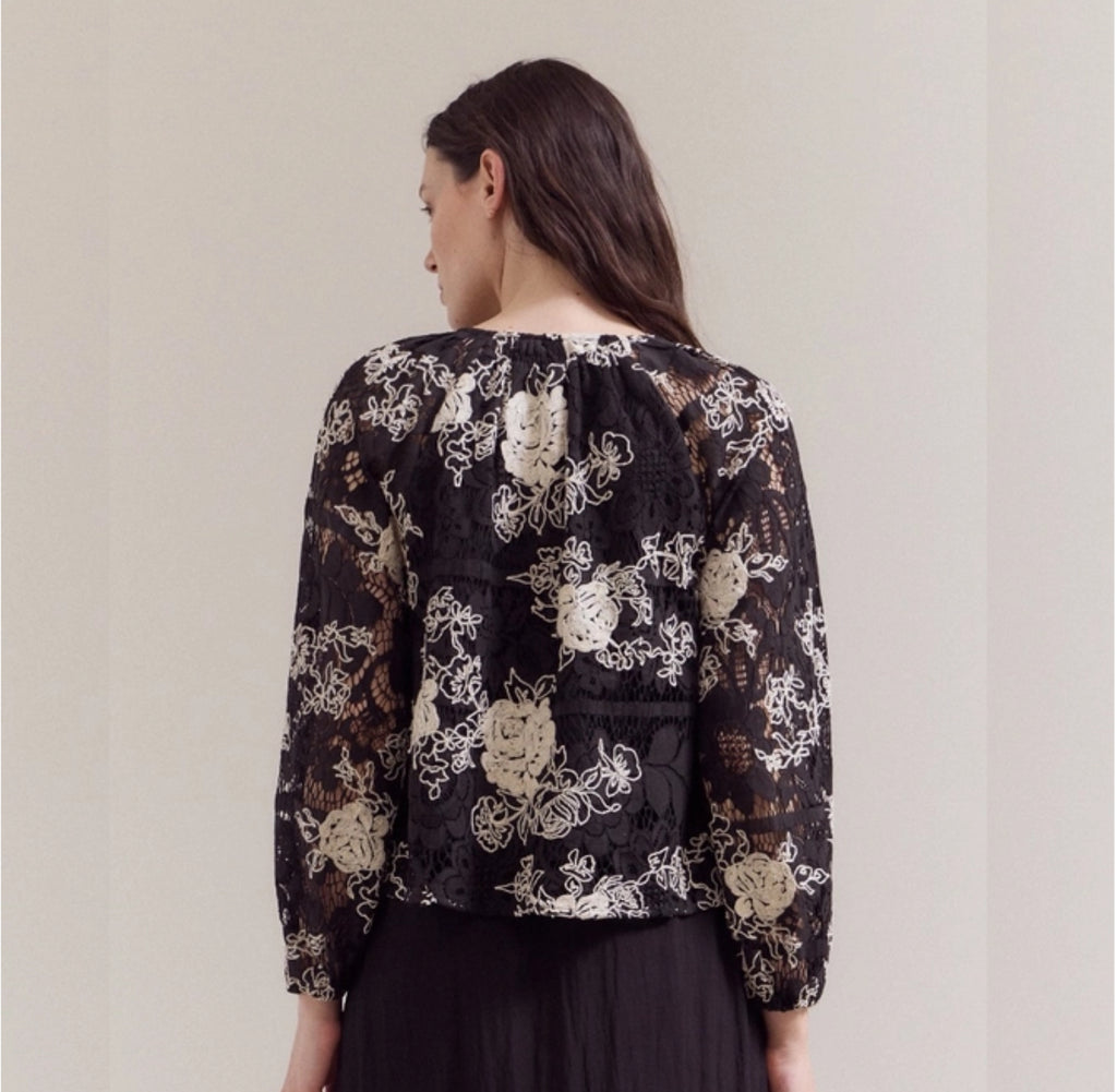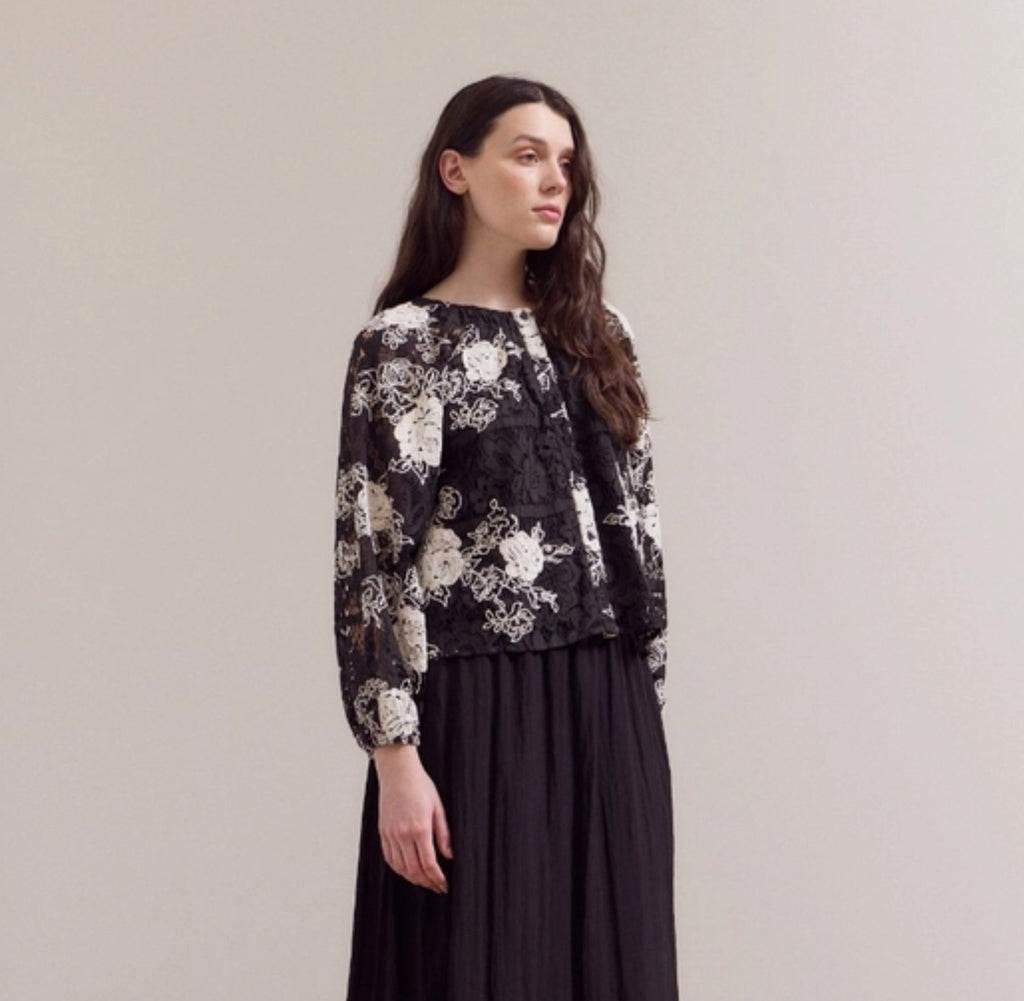 Elevate your wardrobe with this sophisticated embroidered top, seamlessly transitioning from daytime elegance to evening allure. Crafted with delicate lace embroidery, the long sleeves provide refined coverage whilst the intricate embroidery adds visual interest and texture. Available in timeless black and cream, this piece offers versatility for layering or wearing standalone. The thoughtful design balances femininity with understated luxury, making it an essential addition for those who appreciate quality craftsmanship and enduring style.