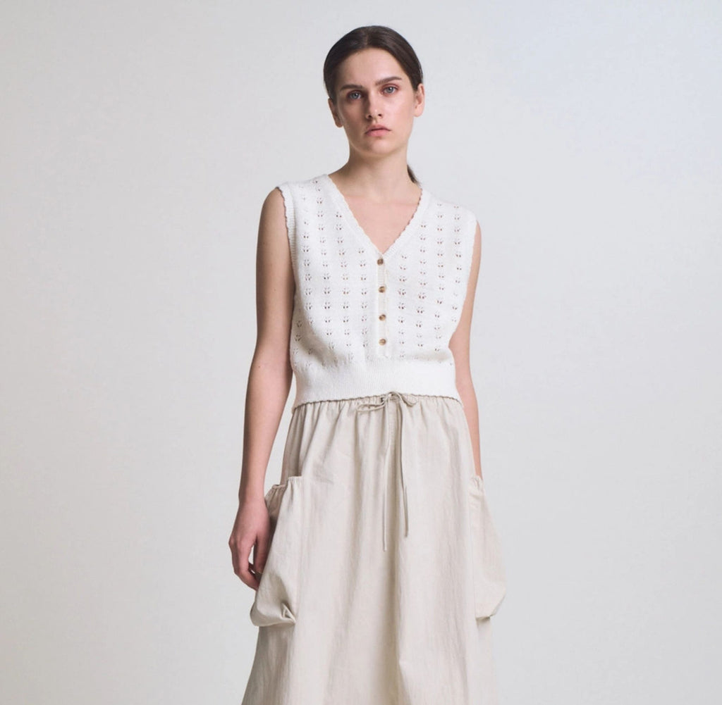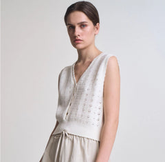 Showcasing a simple yet gorgeous floral knit vest, crafted from pure 100% cotton for breathable comfort and lasting durability. The delicate flower cut-out detailing adds an artistic dimension to the classic button-down silhouette, making it an ideal layering piece for transitional seasons.