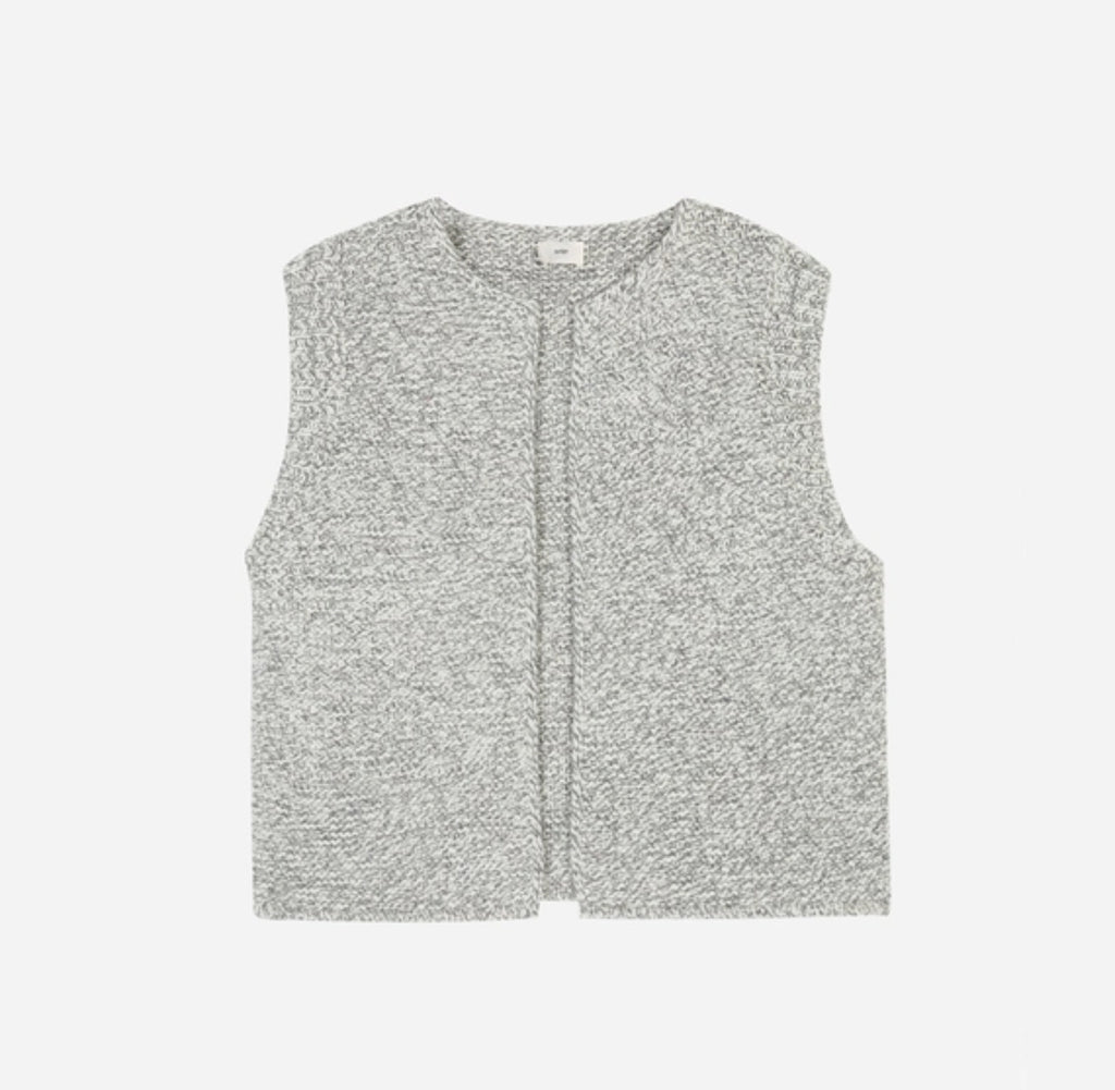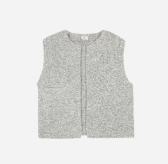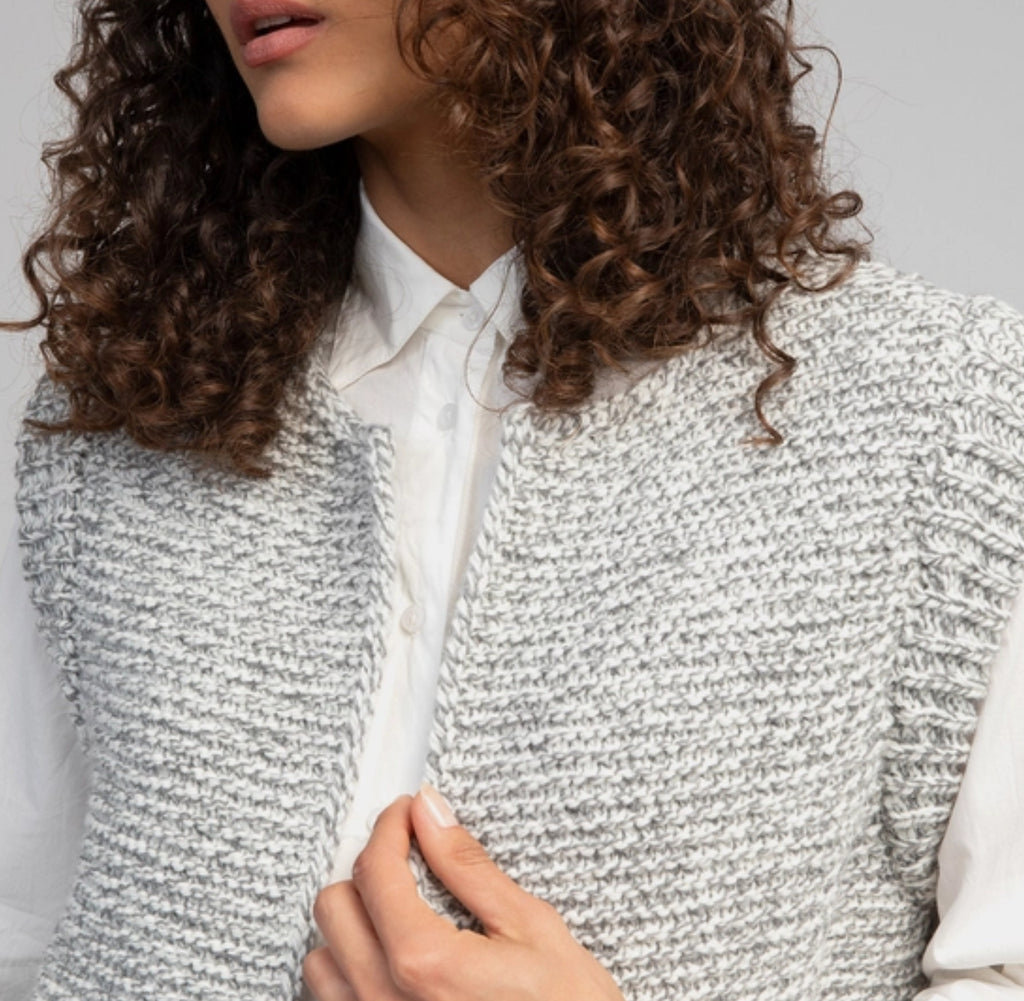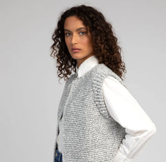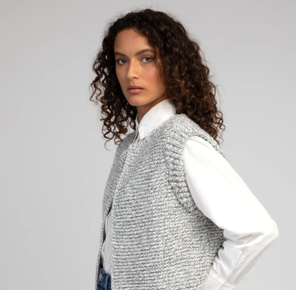 This Heather Grey Gilet is a grey and white knitted short gilet, crafted in one size for versatile wear. Designed in France, it combines refined style with cozy texture, making it a sophisticated layering piece ideal for enhancing your outfit’s depth and warmth.