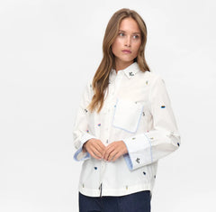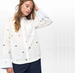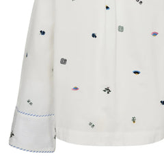 The Nuchiro Boxy Shirt offers a refined design with crisp white fabric and distinctive embroidered details that enhance its sophistication. Inside the cuffs, a striped fabric adds a subtle yet stylish contrast. Its boxy shape ensures a contemporary fit, blending comfort with modern tailoring for a versatile wardrobe essential.