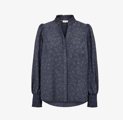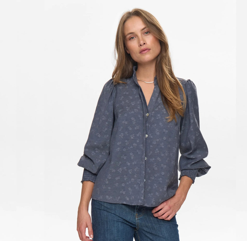 The Nucila Shirt features a mid denim blue fabric adorned with a subtle tonal floral pattern, offering a refined yet relaxed look. Its pop-over design ensures effortless wear, while elasticated 3/4 sleeves provide comfort and ease of movement. This blouse combines style with practicality, making it a versatile addition to any wardrobe.