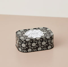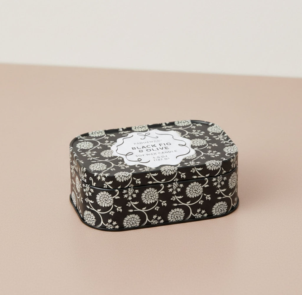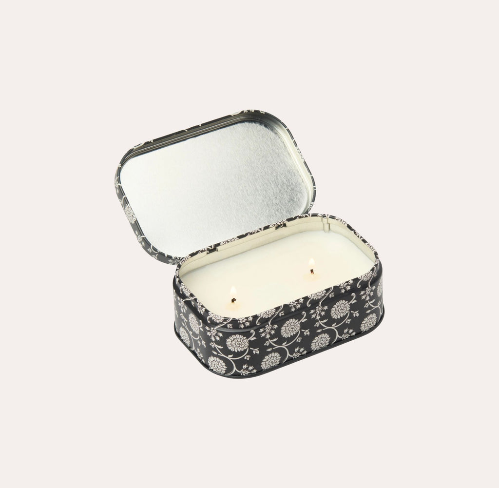 Our new Cherie collection effortlessly brings a touch of charm to any space. The new Cherie tin candle effortlessly brings a touch of charm to any space. This elegant, patterned tin has two wicks, a hinged lid, and a removable label so that once the wax has burned, it is perfectly suited to hold all your trinkets!