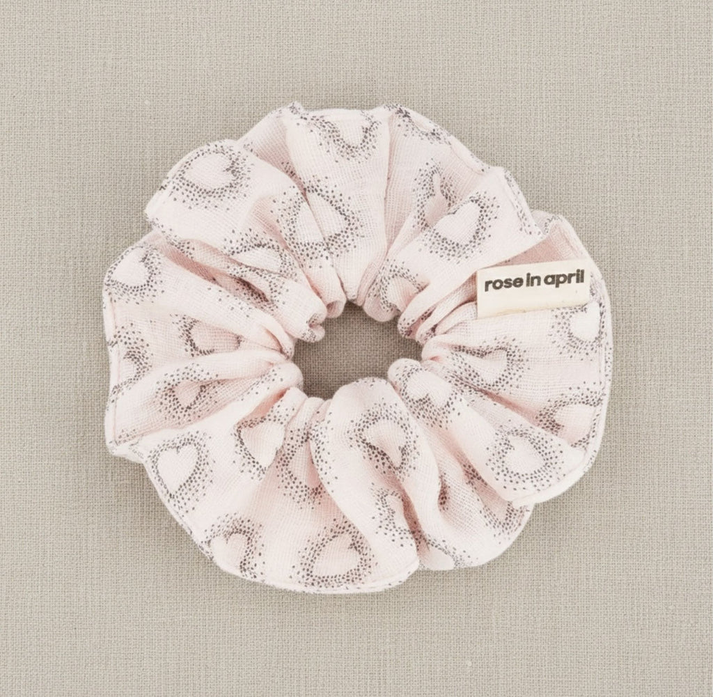 A pretty soft scrunchie in a pale pink fabric with a delicate dotty heart design. Muslin swaddle 100% cotton fabric