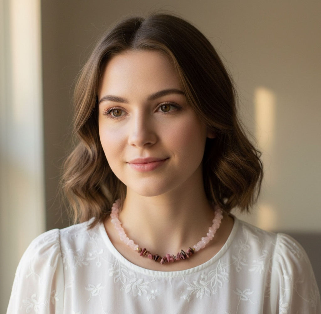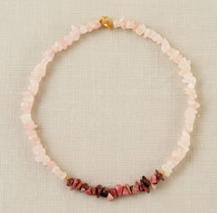 Delicate rose quartz chips are strung together and mixed with terracotta metal chip to create an understated piece that celebrates natural beauty and elegance. Each stone carries its own subtle variations in colour and texture, making this necklace distinctly individual. The secure metal findings ensure durability, whilst the adjustable 16" length with 2" extender accommodates various necklines and styling preferences. Perfect for layering or wearing alone, this versatile design complements both everyday wear and special occasions.