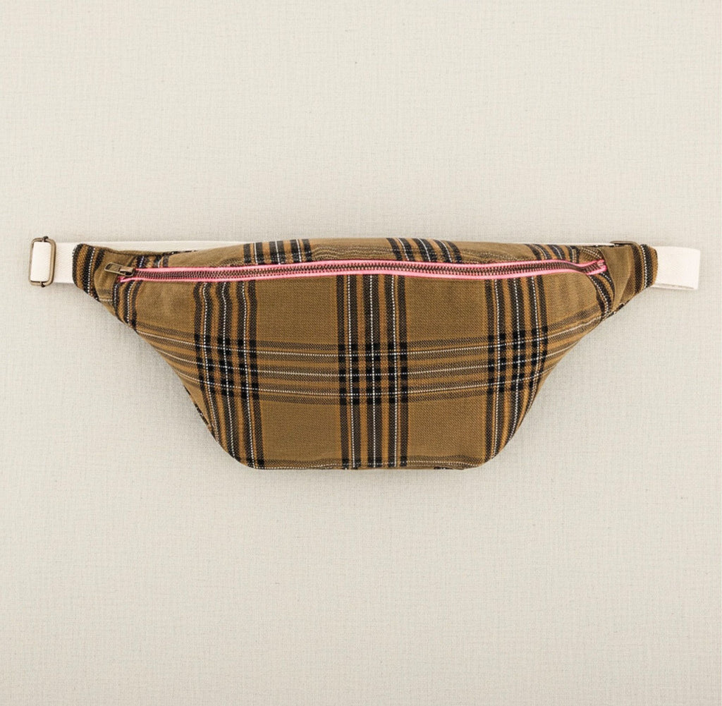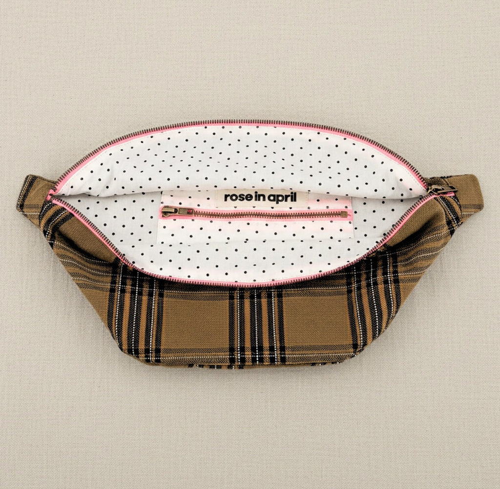 A sweet, casual bag in a deep tartan colour way with a bright pink zip, made from a durable strong cotton Canvas. Lined with a dotty cotton fabric.